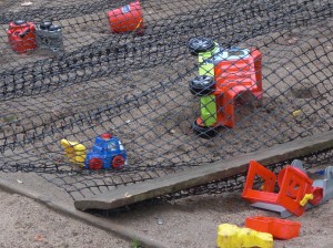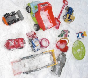 I höstas såg det ut som på bilden till vänster. Sen kom snön, och nu har nån grävt fram de plastleksaker som områdets barn har dumpat i sandådan. Vad händer när de utsätts för fukt?